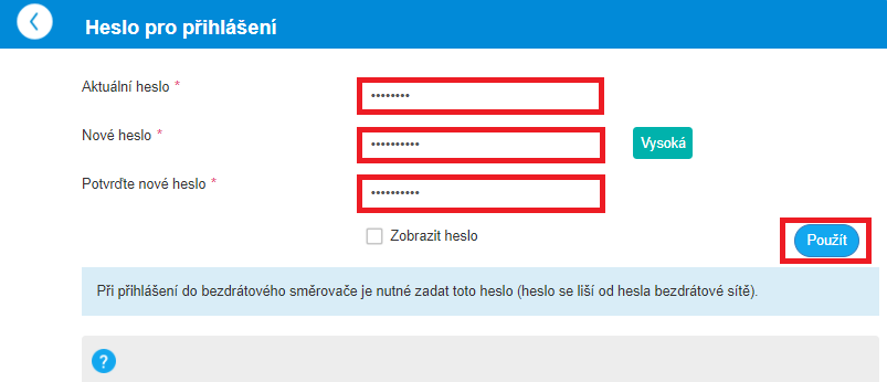 - Aktuální heslo = Stávající heslo, pokud jste ho neměnili, najdete na štítku na spodní straně modemu.