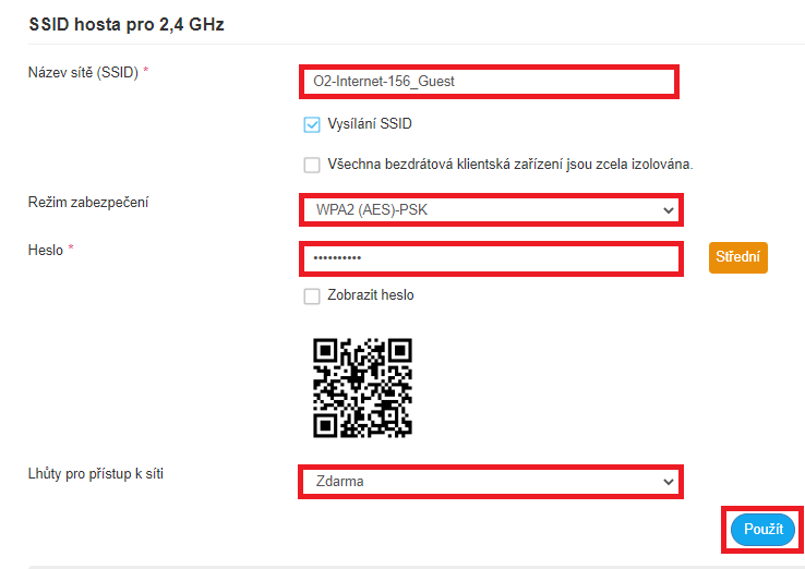 - Heslo = Napište heslo, kterým chcete svou hostovskou Wi‑Fi síť zabezpečit. Heslo musí mít minimálně 8 znaků. Nepoužívejte diakritiku ani mezery.